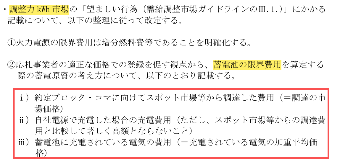 一方、需給調整ガイドラインに、蓄電池の限界費用の算定方法が新しく定められました。価格規律が厳格化されるわけです。具体的な追記事項は下記の通りです。