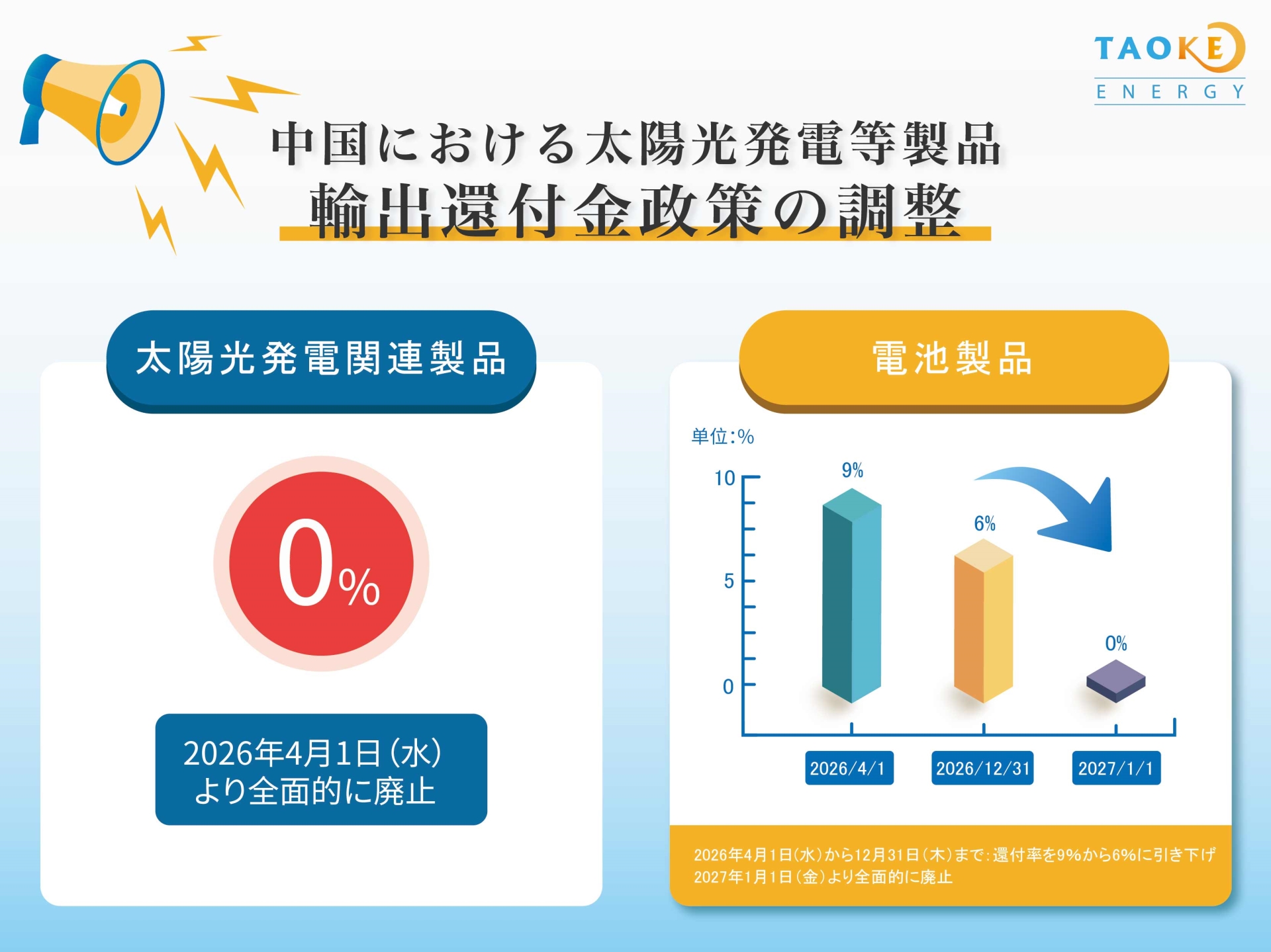 中国政府は1月、太陽光発電関連製品や蓄電池を対象としてきた輸出還付金について、段階的に廃止する方針を打ち出しました。具体的には、2026年4月から太陽光発電関連製品への輸出還付金を廃止し、蓄電池関連製品に対しては、4月1日以降は現在の9%から6%に引き下げ、2027年1月以降に廃止する方針です。