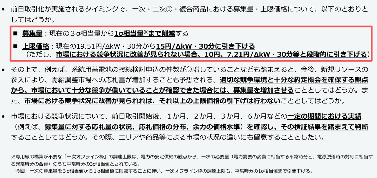 また、募集量についても、経産省は現在の3σ相当量から2026年度以降、1σ相当量まで削減します。市場での調達量をコントロールしつつ、上限価格に張り付いた約定を減らし、調達価格を低減させる狙いです。